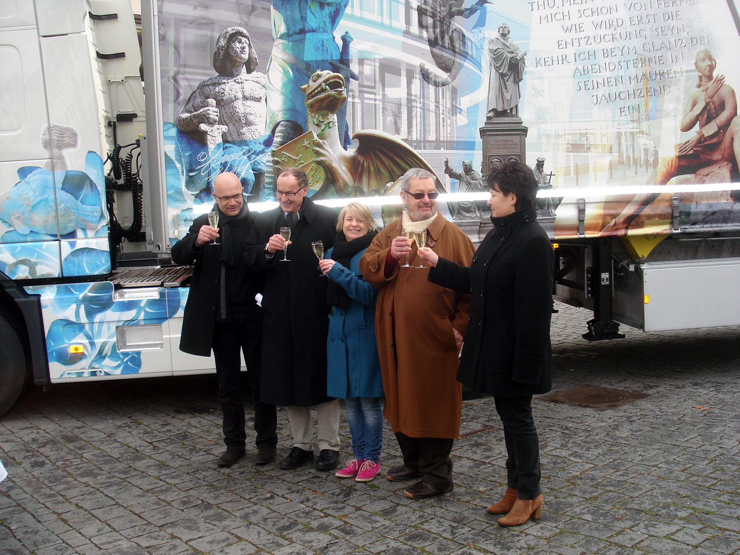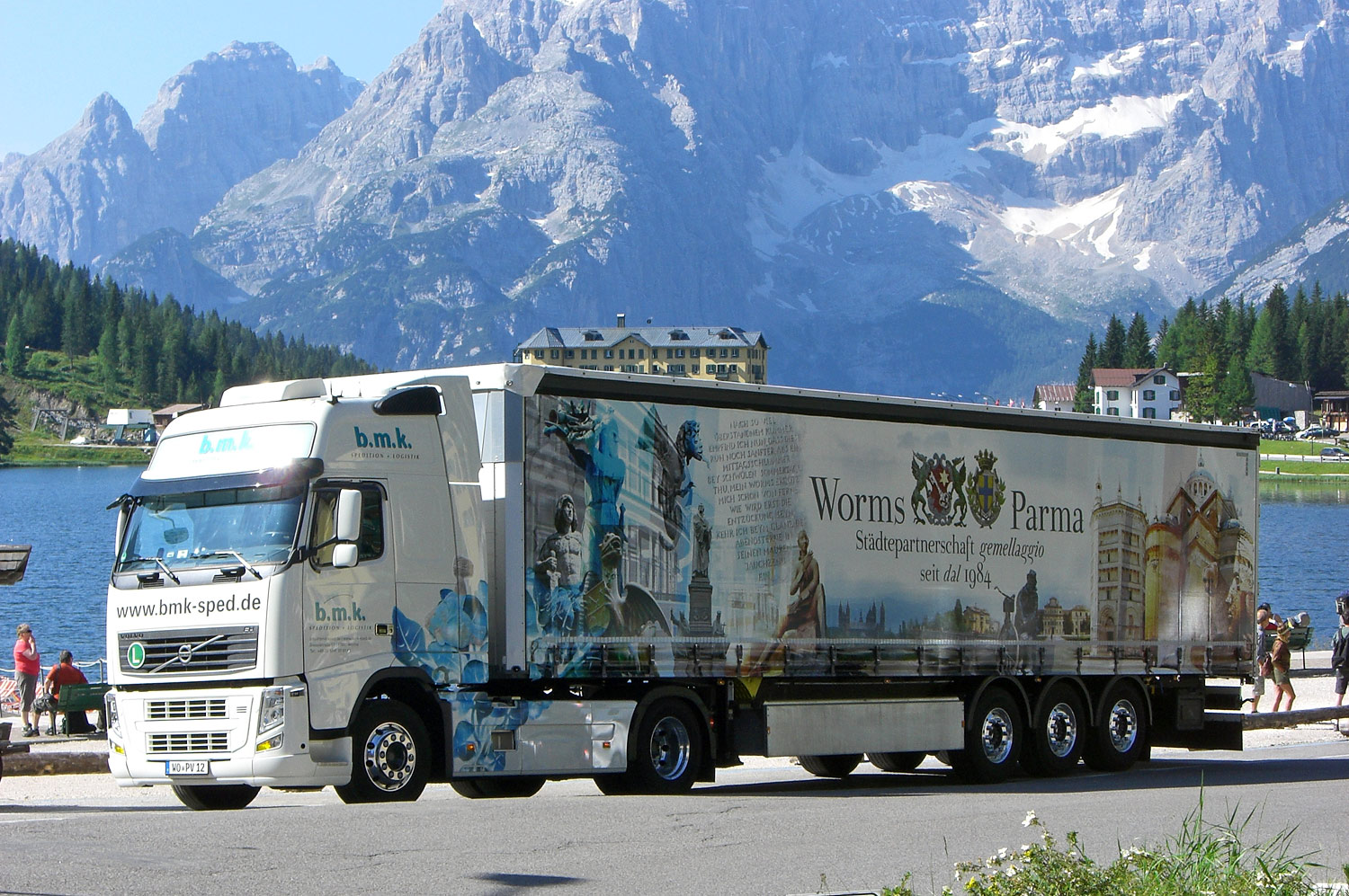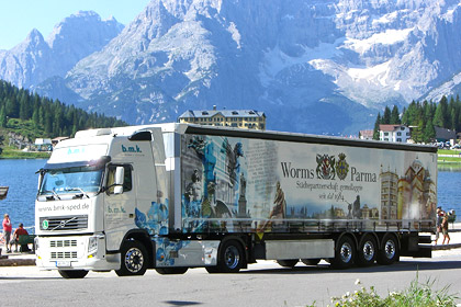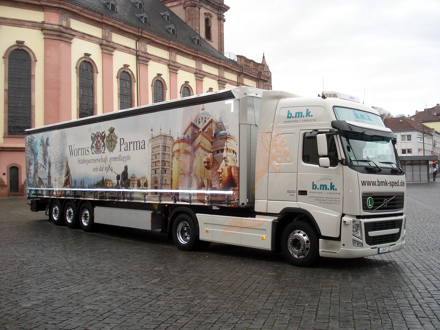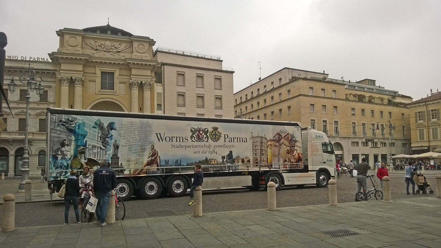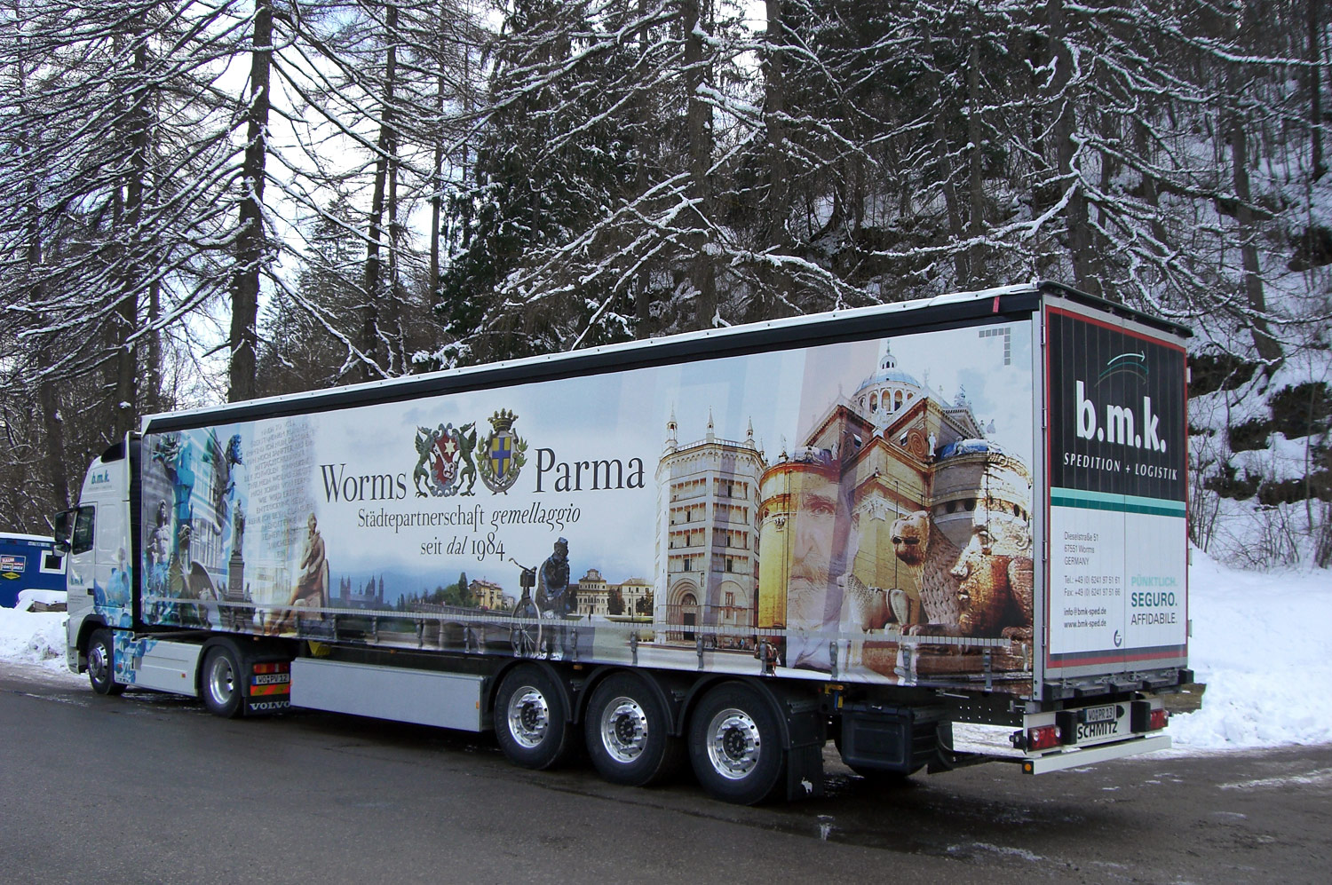 Der Auflieger mit XL-Code gibt weitere Sicherheit bei der Beförderung. Auf der Plane ist die Partnerschaft zwischen Worms und Parma als Collage in eindrucksvoller Weise als ein "Hingucker" dokumentiert.